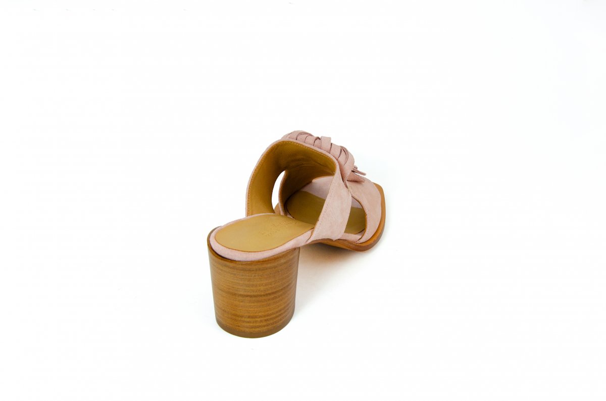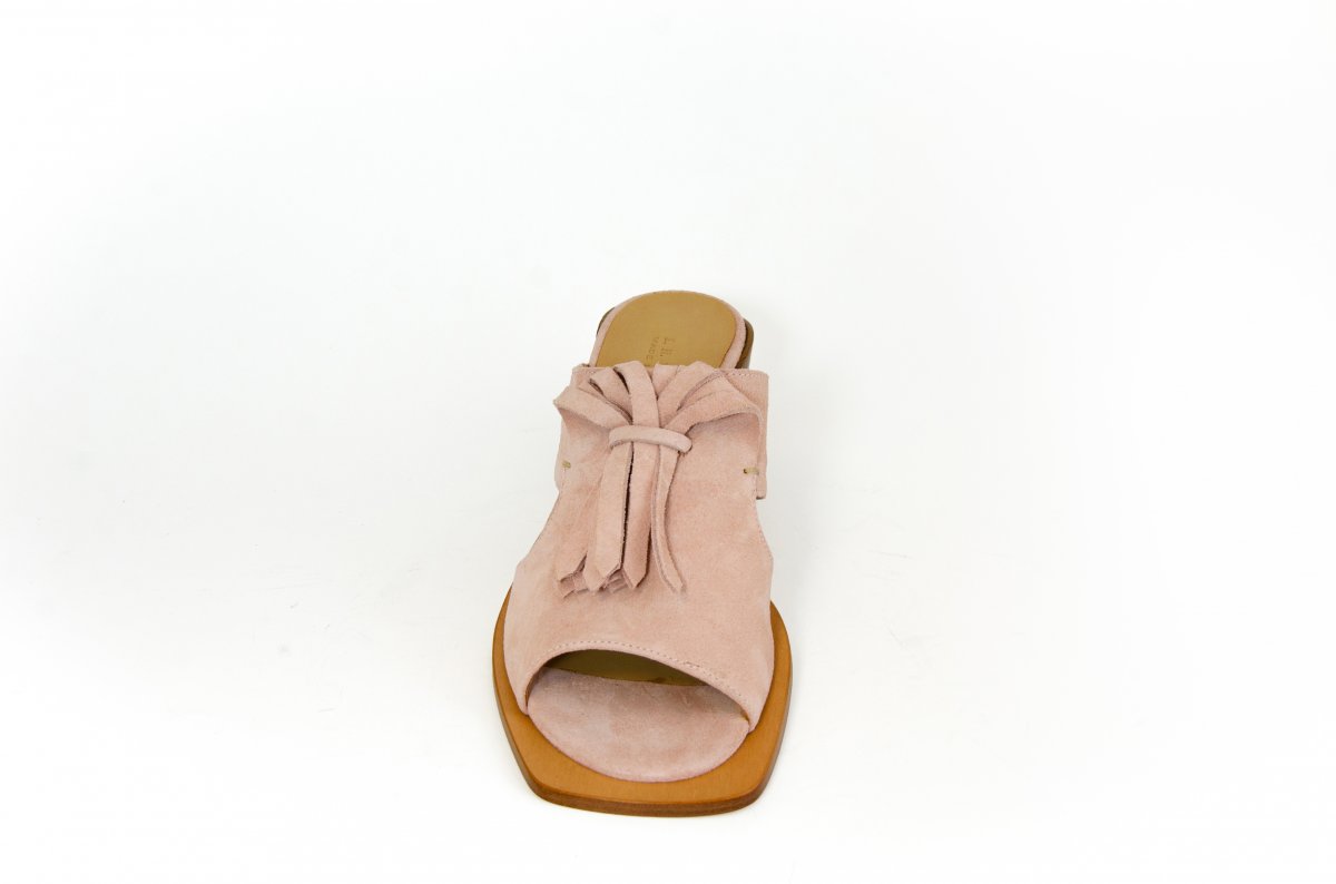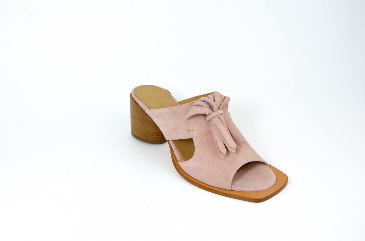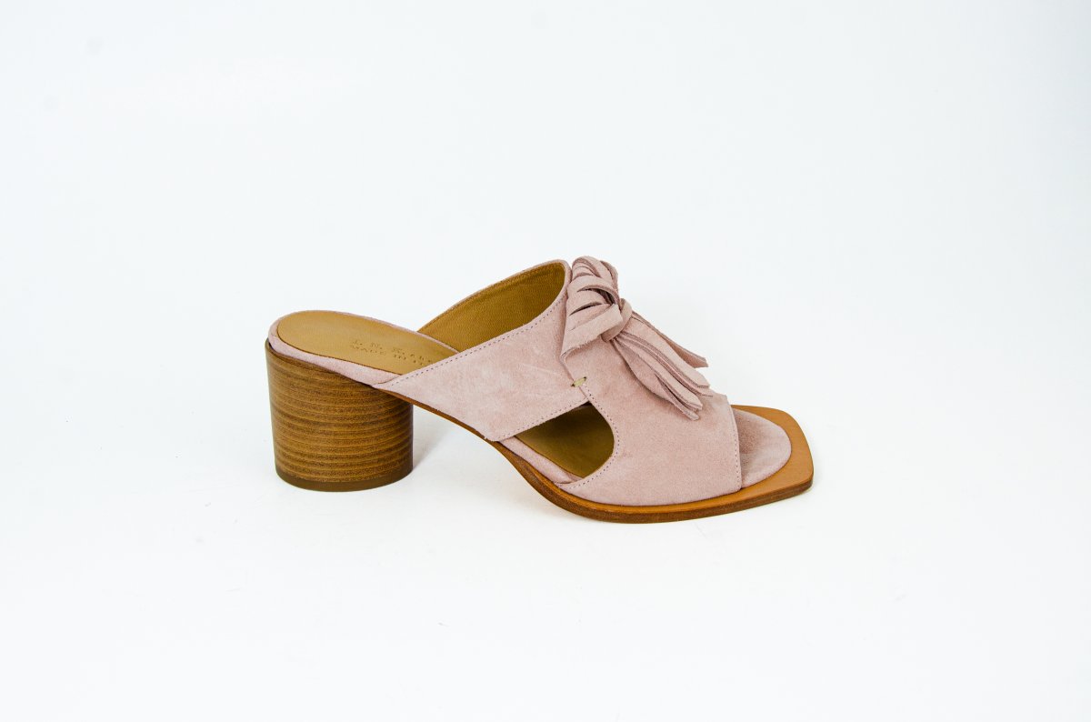 Suede leather sandal with a 50 mm heel, featuring decorative fringes for a sophisticated touch.